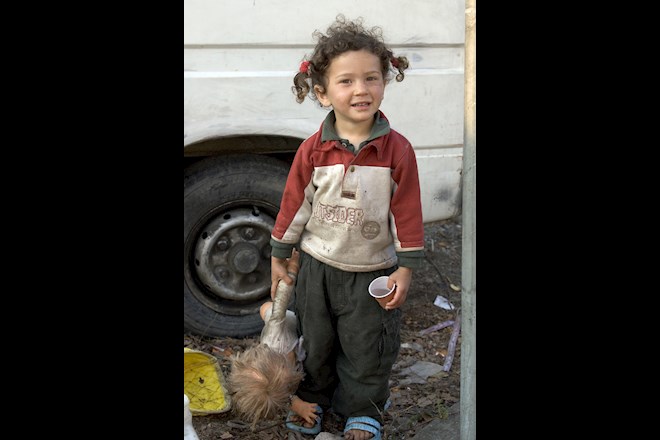 A Roma (gypsy) child finds herself on the side of a road in northern Italy, ironically wearing a shirt that proclaims, Outsider. Her family, which fled the ethnic turmoil in Bosnia, is always on the move. Poverty, discrimination and social customs combine to make Roma children vulnerable to trafficking.