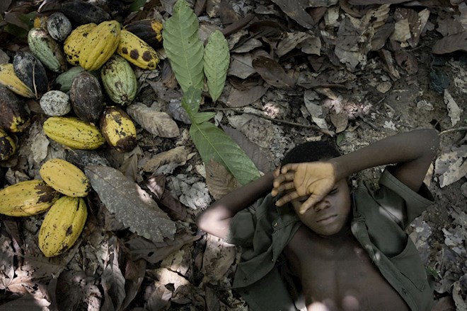 Nine-year-old Jean Baptiste doesn't attend school. Work begins at 8 a.m. and involves cutting cocoa fruit off the trees with a machete and removing the beans. The family has no other viable source of income. Jean Baptiste has no idea what happens to the cocoa beans. Here he is taking a short rest from the strenuous work.