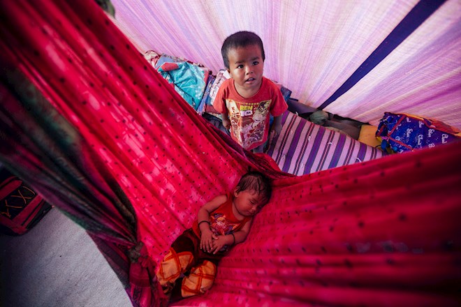 GoodWeave International’s Executive Director, Nina Smith, was a part of the team that visited Som and his family. After her visit, Smith reflected, “I walked into the tent that is now Som’s temporary home, and I saw a sarong stretched into a makeshift cradle with a baby inside. The air was heavy and damp, as monsoon rains have already begun.”
